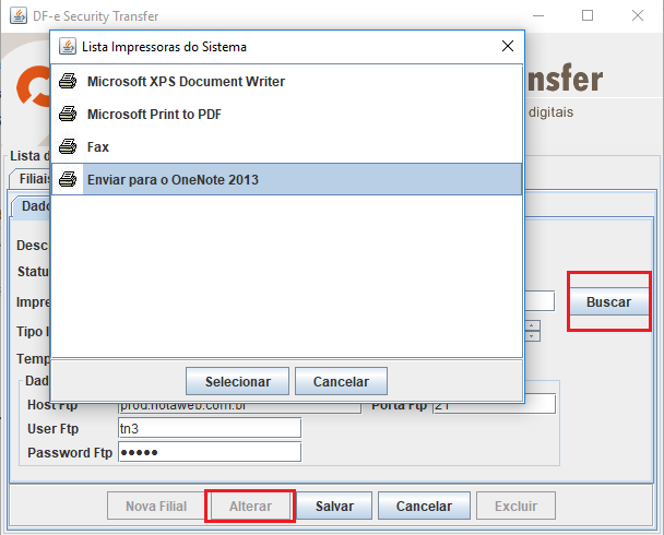 Para alterar a impressora primeiramente é preciso clicar em “Alterar” , e em seguida “Buscar” após isso ira aparecer as impressoras listadas na sua maquina, bastando selecionar e clicar em “Selecionar”.