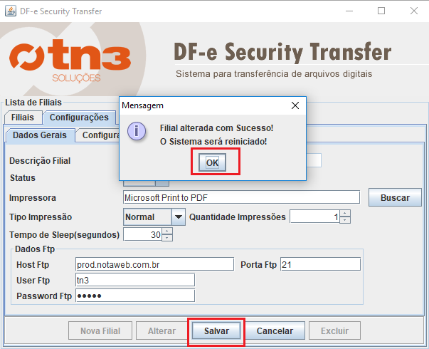Feita as alterações clicar em “Salvar” . Após o sistema mostrará uma mensagem pedindo confirmação para reinicio do aplicativo transfer. Basta clicar em “ok” e o sistema se reiniciará sozinho.
